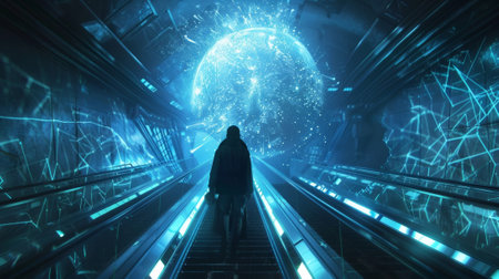 A solitary figure walks through a vibrant tunnel filled with glowing blue particles, symbolizing a journey into the unknown and evoking a sense of wonder and exploration.