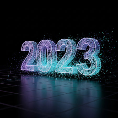 This artwork features a large, glowing wireframe representation of the year 2023 against a dark background, highlighting a futuristic design.