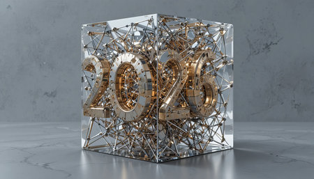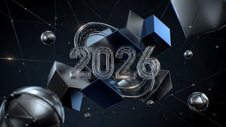 a futuristic metallic cubes forming the year two thousand twenty six in dark space render