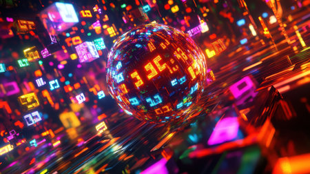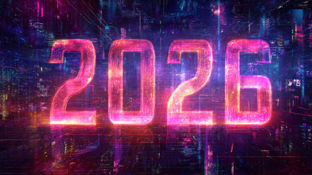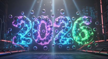 A vibrant and futuristic image showcasing the year 2026 with glowing, colorful numbers surrounded by bubbles, set against a dark, industrial background. Perfect for New Years themes.