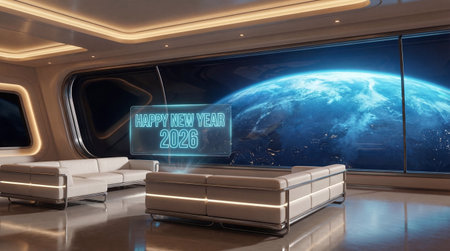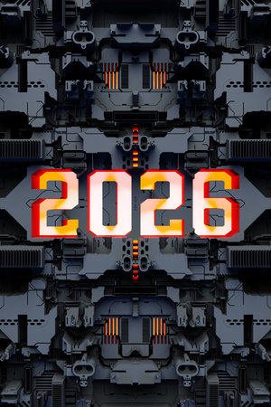 Bold blue numerals read 2026, set against a complex, futuristic technological backdrop. The image features a dark color palette, with metallic textures and digital elements creating a high-tech aesthetic. This composition suits design projects, promoting concepts of innovation and forward-thinking, or for illustrating themes of technology.