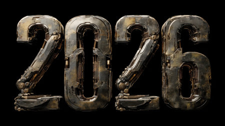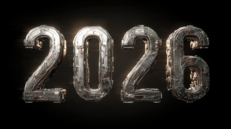 Futuristic metallic numbers representing year 2026, designed with intricate details and sleek finish, set against dark background, conveying sense of innovation and technology