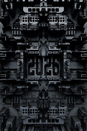 3d illustration Futuristic tech postcard with the year 2026 on the background of a metallic, technological cover of a spaceship or robot. Abstract graphics in the style of computer games.