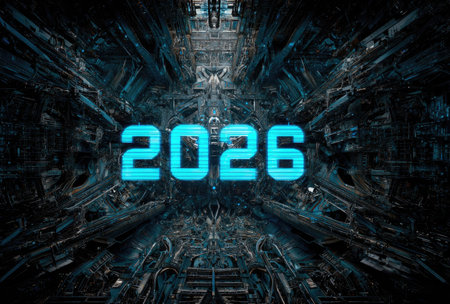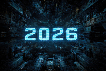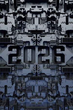 A digital composition features the year 2026 in bright blue, set against a complex, industrial-looking background. The image showcases geometric patterns, suggesting a technological or sci-fi theme. This graphic could be used for various projects related to innovation, future concepts, or digital design elements. It's suitable for both commercial and editorial applications.
