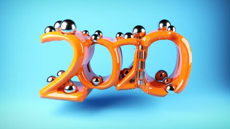 Figure 2020 made of bright orange plastic with round chrome balls inside. Overall composition over studio blue lit background. Christmas and New Year mood design. 3d illustration