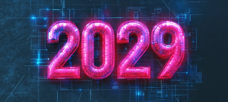 Glowing 3D Number 2029 on Futuristic Circuit Board Background, Digital Abstract Concept