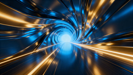 Digital data stream traversing abstract glowing light tunnel