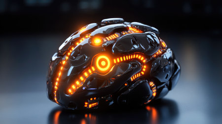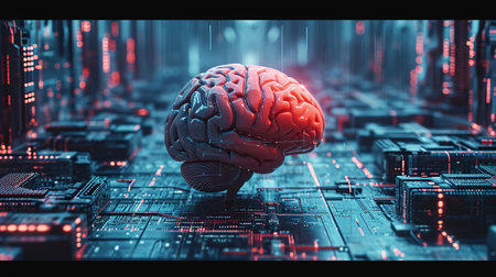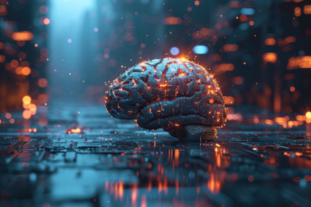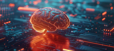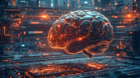 This striking depiction showcases a digital brain illuminated by vibrant orange lights, resting on complex circuitry. It captures the essence of artificial intelligence and technological innovation.