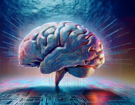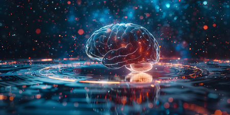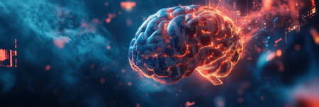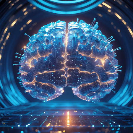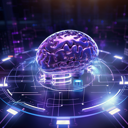 Digital brain illustration with glowing neural connections is set against an abstract technology background, representing advanced cognitive processes and the intersection of technology and intelligence
