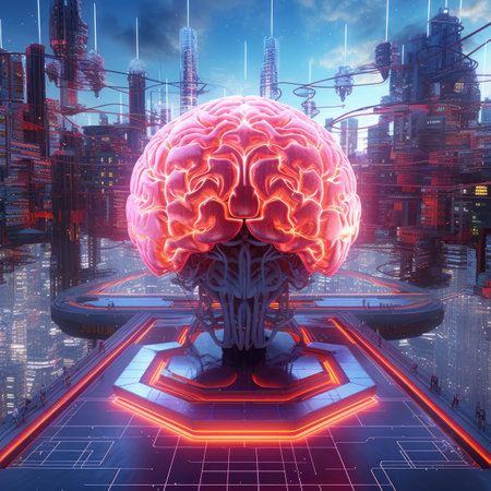 Futuristic Brain Over Cyber Cityscape. Generative AI