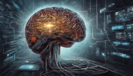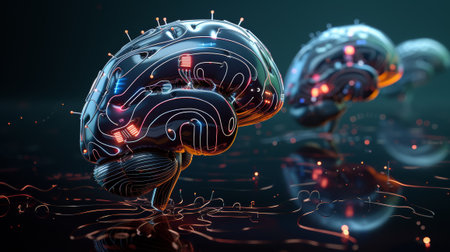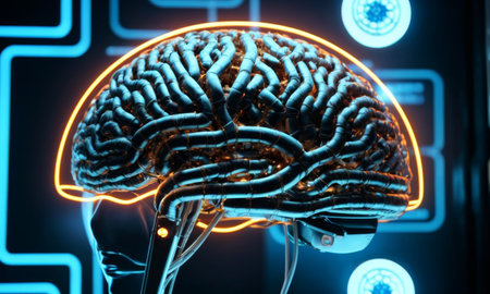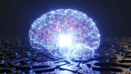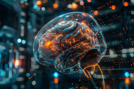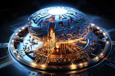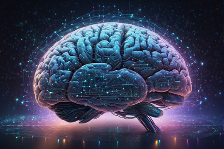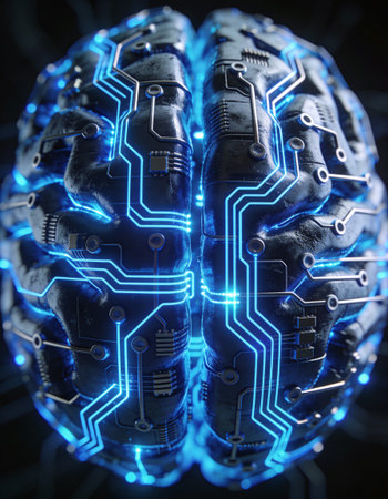 Illuminated human brain integrates with electronic circuits, suggesting artificial intelligence capabilities and cutting-edge technology Suitable for AI and innovation projects.