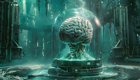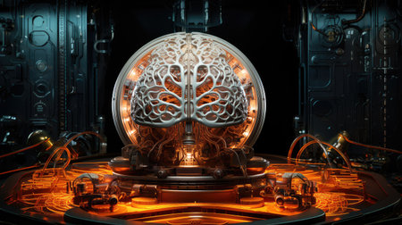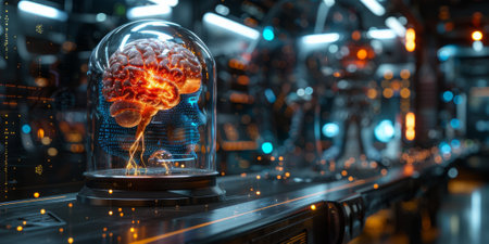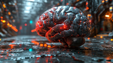Experience a futuristic scifi environment featuring a human brain surrounded by advanced technology in a dark, immersive setting. Ideal for digital art.