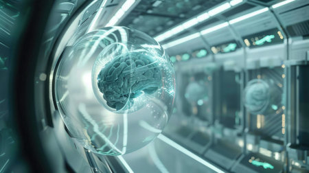 A high-tech visualization of brain preservation, showcasing a human brain enclosed in a transparent spherical container, set within a sleek laboratory environment. The image conveys themes of scientific advancement, neurotechnology, and the exploration of human consciousness