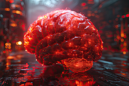 A stylized, glowing brain with intricate details, bathed in vibrant neon red and blue light beams radiating outwards, set against a grid-like digital environment.