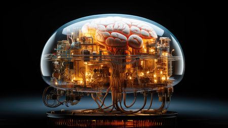 An artistic representation of a brain encased in glass, surrounded by glowing lights and wires, symbolizing the fusion of technology and neuroscience in a modern aesthetic.