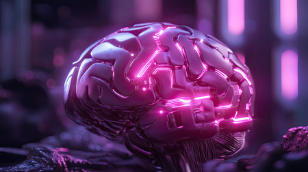 This captivating image features a metallic brain with glowing pink neural pathways, representing the fusion of technology and biology. Ideal for futuristic and science projects.