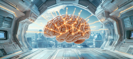 Futuristic spaceship interior showcasing a floating human brain with highlighted connections, overlooking a futuristic cityscape through a large window