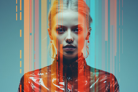 Young female model posing with trendy fashion outfit and colorful glowing vibrant green lime and pink optical art abstract background. Picturesque generative AI