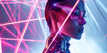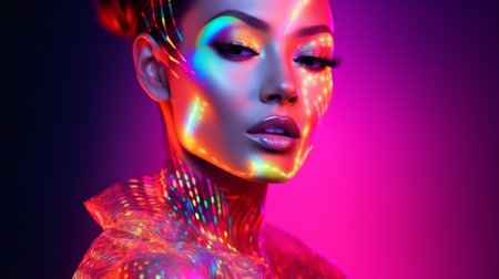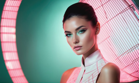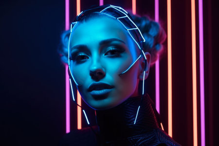AI Generated. Stunning model lit by neon lights which outline her striking features and futuristic attire