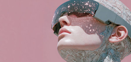 Futuristic woman with electronic circuits on skin wearing vr headset experiencing metaverse