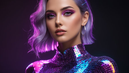 A model showcases a glamorous look with purple hair and a shiny silver outfit. The vibrant backdrop features soft, colorful lights that enhance the artistic expression.