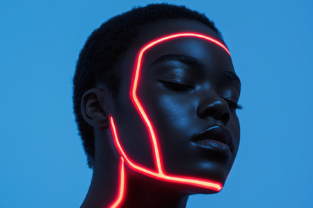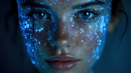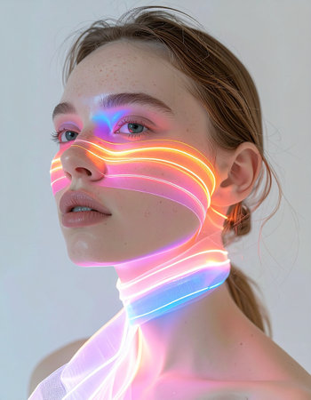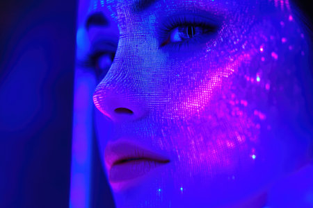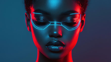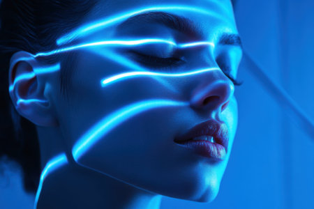 A captivating image featuring a womans serene expression highlighted by neon blue light stripes across her face. the futuristic glow adds an ethereal and modern aesthetic.