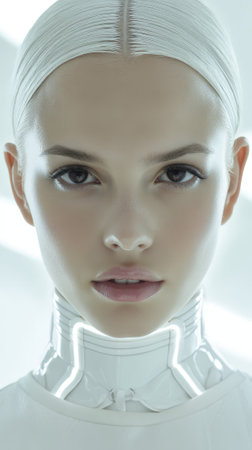 Futuristic portrait of a person with sleek white hair and glowing collar, evoking a sci-fi or cybernetic theme. Smooth skin and intense gaze create a surreal, otherworldly feel