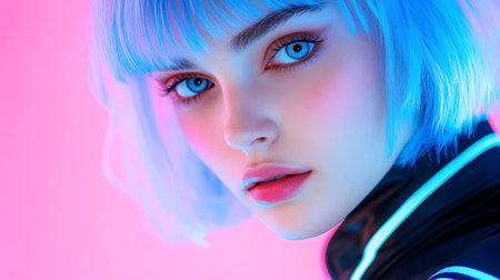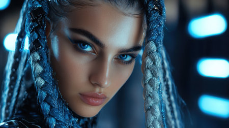 Futuristic portrait of a woman with vibrant blue hair and intense stare in neon lighting.