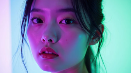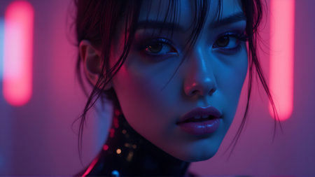 Close-up portrait of a young woman in a cyberpunk setting illuminated by neon lights. Her expression is intense and mysterious.