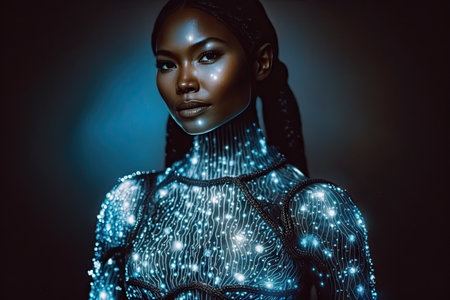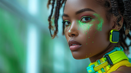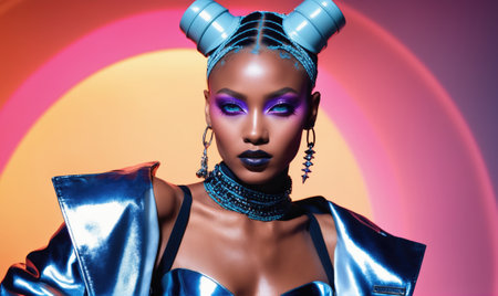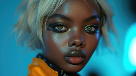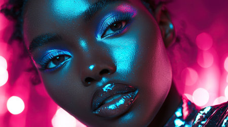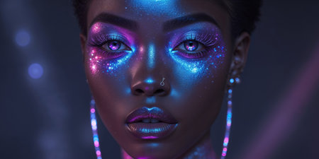 AI Generated. African female with cosmic neon glitter makeup in dark setting