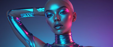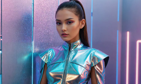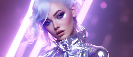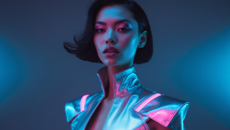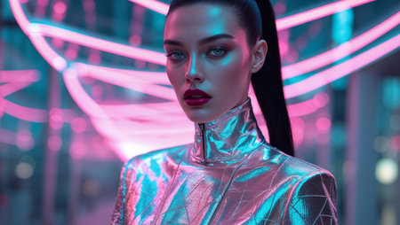 AI Generated. Fashion model posing under neon lights wearing futuristic metallic clothing