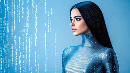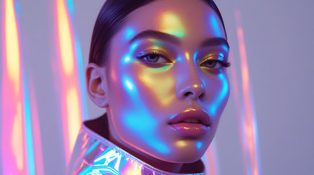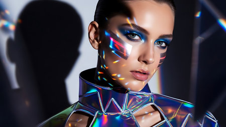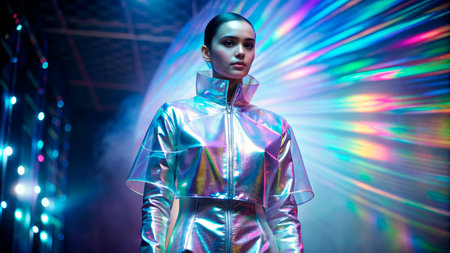 In a modern studio a fashion model poses confidently wearing a striking outfit made of iridescent material. Bright makeup enhances her features creating a captivating look.