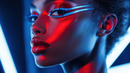 A striking portrait showcases a model with bold makeup and vivid lighting. The dynamic colors create an electrifying atmosphere, highlighting the subject's features and expression.