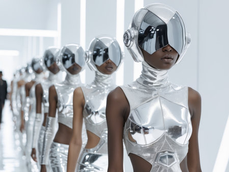 AI Generated. Futuristic fashion runway featuring models in metallic outfits and helmets during a stylish event