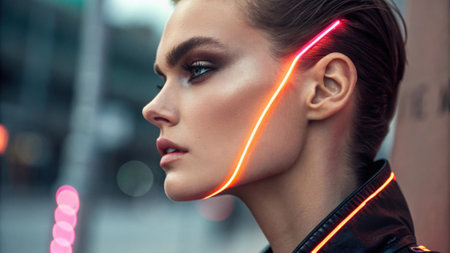 A visually striking profile portrait emphasizes the models sharp features adorned with a vibrant neon light dancing along the cheekbone creating an arresting focal point in the.