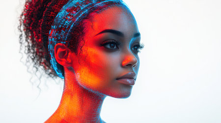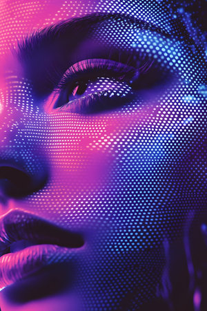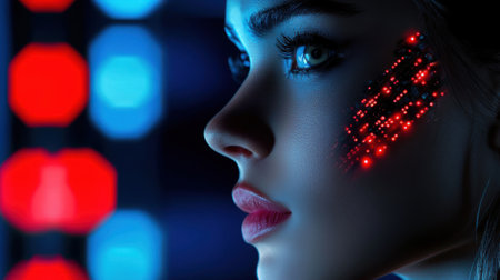 A woman with a face covered in glowing red dots. The image is a futuristic, sci-fi style photo