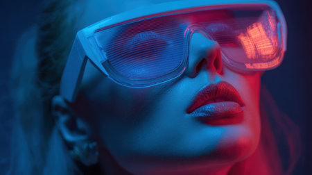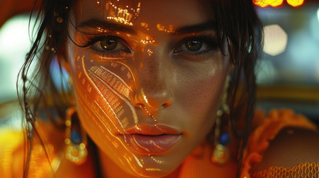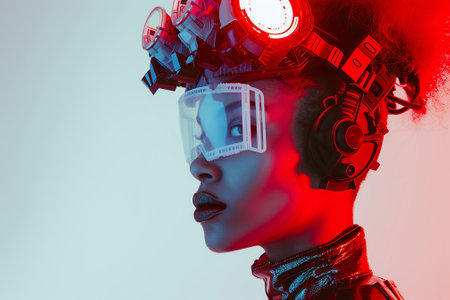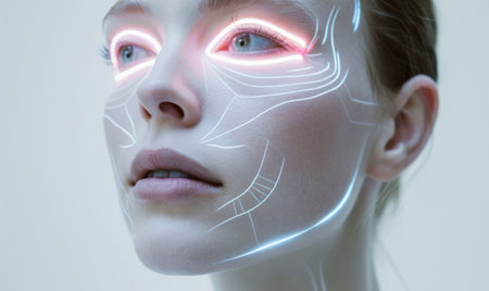 Futuristic portrait of a woman with glowing lines on her face and red light in her eyes