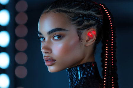 The woman showcases stylish braids and glowing earbuds, exuding confidence in a futuristic setting filled with neon lights, highlighting her striking features.