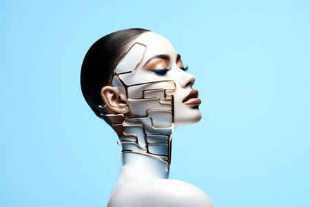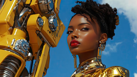 A striking portrait of a woman with a futuristic golden outfit, exuding confidence and beauty beside a robotic figure against a vibrant blue sky.