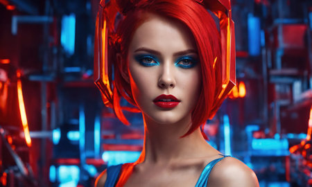 Futuristic woman with red hair in futuristic costume. ai generative.