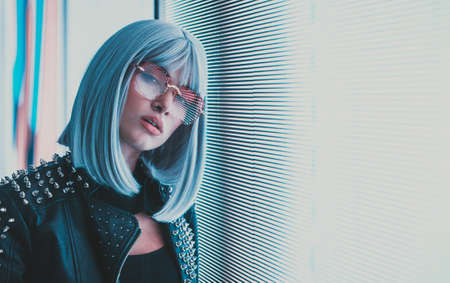 Image of a beautiful young woman posing against a led panel. teenager with alternative look and gray wig making urban portraits