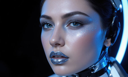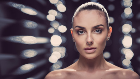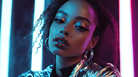 A confident woman with a nose piercing, wearing a metallic jacket and cat-eye eyeliner, posing under futuristic lighting.