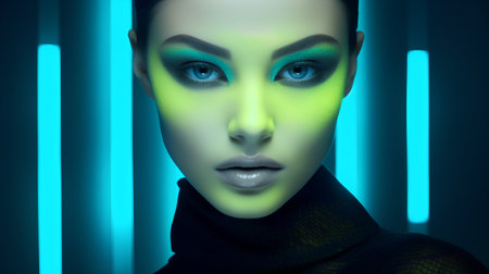 Futuristic woman. Portrait of a beautiful girl with neon makeup.