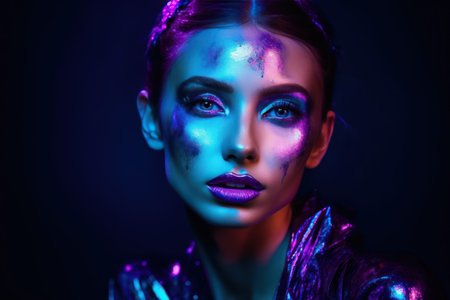 high fashion model metallic silver lips and face woman in colorful bright neon uv blue and purple li