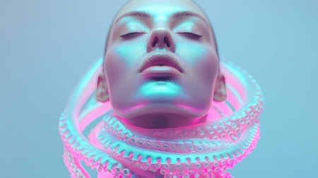 Futuristic female model with glowing skin, adorned with translucent elements, showcasing emotions in an abstract, vibrant blue and pink setting.