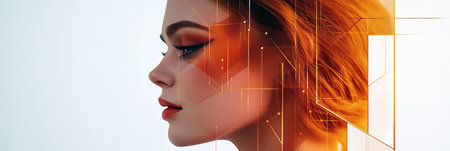 Vibrant Abstract Portrait of a Beautiful Model with Red Hair Surrounded by Lines, Grids, and Glows