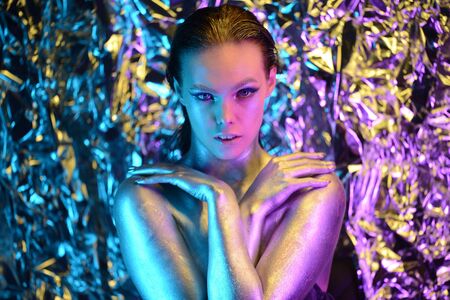 Portrait of a European beautiful woman with shiny holographic makeup in a shiny dress