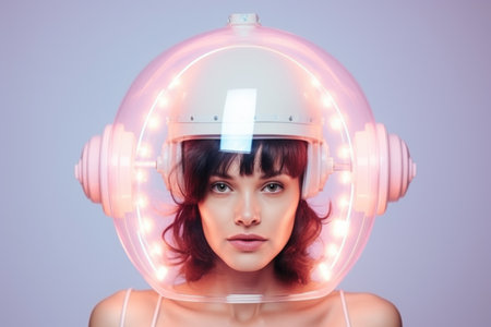 Futuristic portrait of a brunette wearing a surrealistic luminous helmet on a gray background.