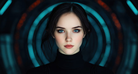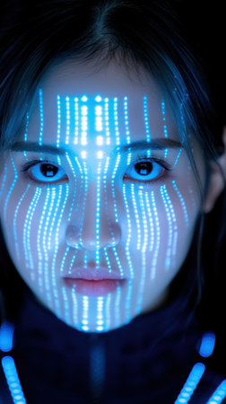 A close-up portrait of a woman's face illuminated by glowing blue neon lines, resembling a circuit board, against a dark background. She has a serious, intense gaze, and a bright vertical light bar is visible to her left, enhancing the futuristic and cyberpunk aesthetic.