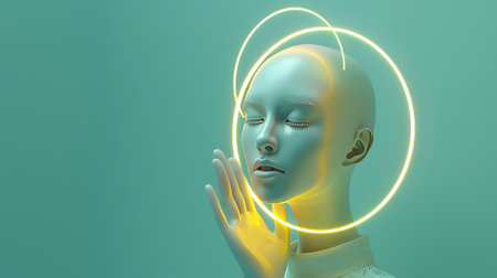 In this 3D render, a mannequin with a bald head and hands is isolated on a mint green background, surrounded by glowing neon. The image could demonstrate jewelry or cosmetics.